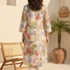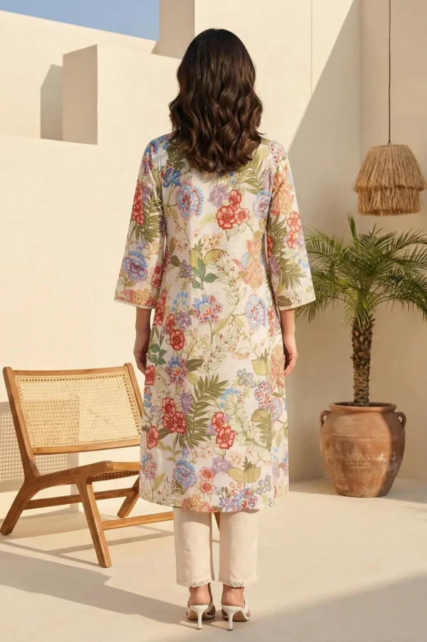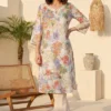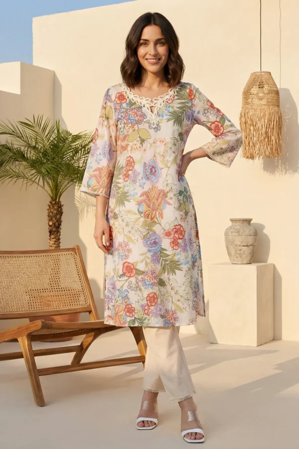 Beautifully crafted for everyday elegance, this floral printed pure cotton kurta in a soothing off-white hue brings a fresh update to your daily wear wardrobe. Designed with a classic straight silhouette and a graceful round neckline, the piece is delicately detailed with subtle lace ornamentation for a refined touch. Featuring three-quarter sleeves and comfortable side slits, it offers effortless movement and breathability. Whether you are stepping out for a casual daytime outing or seeking comfortable Indian ethnic wear for the office, this versatile calf-length piece ensures a flattering fit. Pair it with your favorite bottoms for a chic and effortless everyday look.