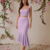 Crop skirt top midi in purple brings soft glam with a modern, body-flattering fit. The ruched crop top features wide shoulder straps and a snug stretch feel that sits comfortably while shaping the upper body. Paired with an asymmetric hem midi skirt, this crop skirt top creates a flowy yet fitted silhouette that feels feminine and stylish. The lilac purple tone adds a fresh, playful mood, while the stretch fabric hugs just right without feeling tight.